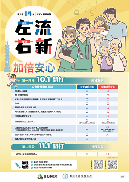 公費流感及新冠疫苗自10 月1 日起分階段開打,接種疫苗能有效降低感染與重症風險,請幼兒、長者及孕婦等高風險族群儘早完成疫苗接種,提升保護力,守護自己與家人的健康。