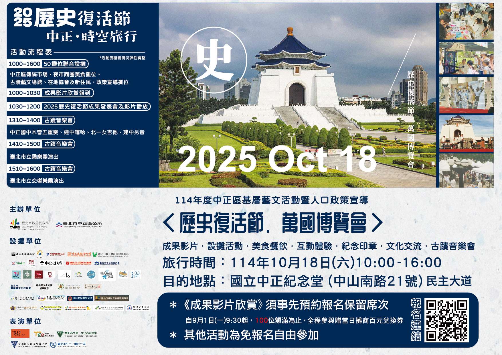 臺北市中正區公所將在114年10月18日(星期六)上午10時至下午4時於中正紀念堂前民主大道(中山南路21號),舉辦「2025歷史復活節.萬國博覽會」,展演歷史復活節活動成果,特邀區內票選優勝的傳統市場、夜市商圈美食攤位、各活動合作機關、在地協會及商圈、博物館、古蹟場館等,一起設置50個活動攤位,下午特邀在地音樂社團、市立國樂團及交響樂團,舉辦古蹟音樂會,邀請您一同品文化、玩體驗、拾回憶,感受獨特的中正區地方特色!更多活動詳情,請上「歷史復活節-臺北市中正區公所」FB粉絲團(https://www.facebook.com/papagozhongzheng),或上臺北市中正區公所網站基層藝文專區(https://reurl.cc/OmyAD7)查詢。