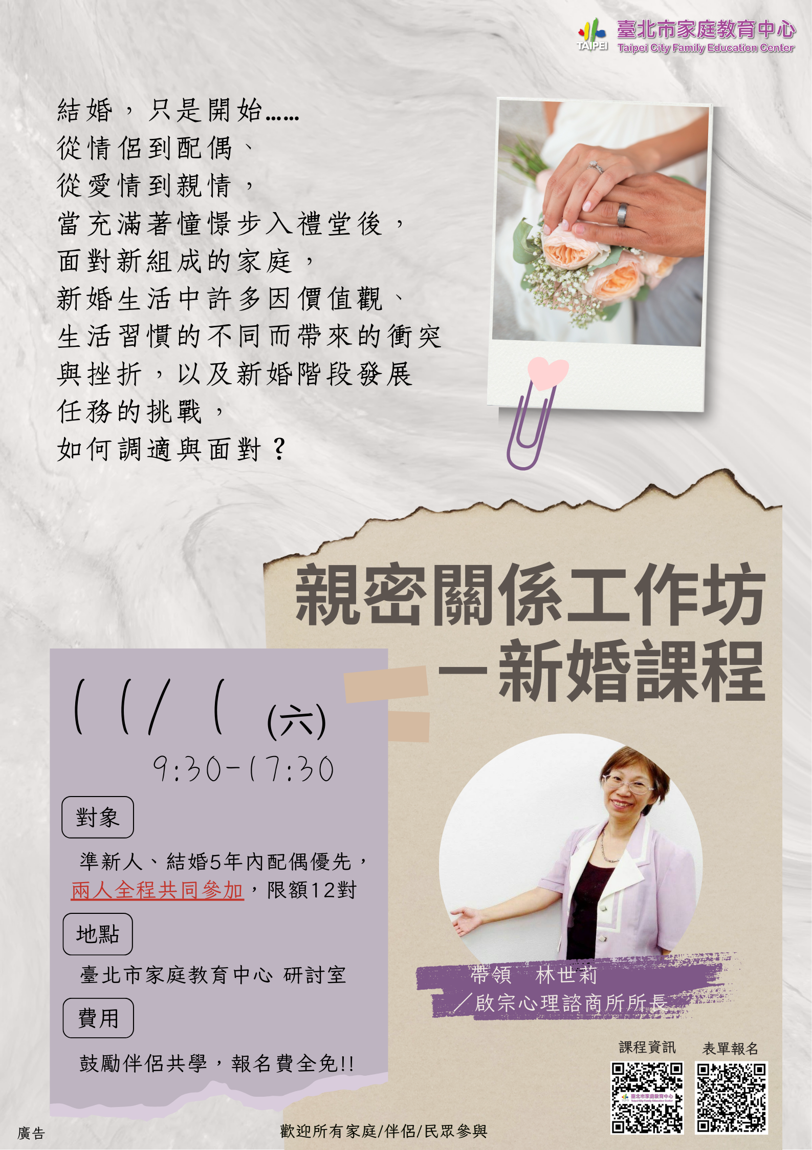 (一)對象:準新人、新婚5年內伴侶,須兩人全程共同參加,