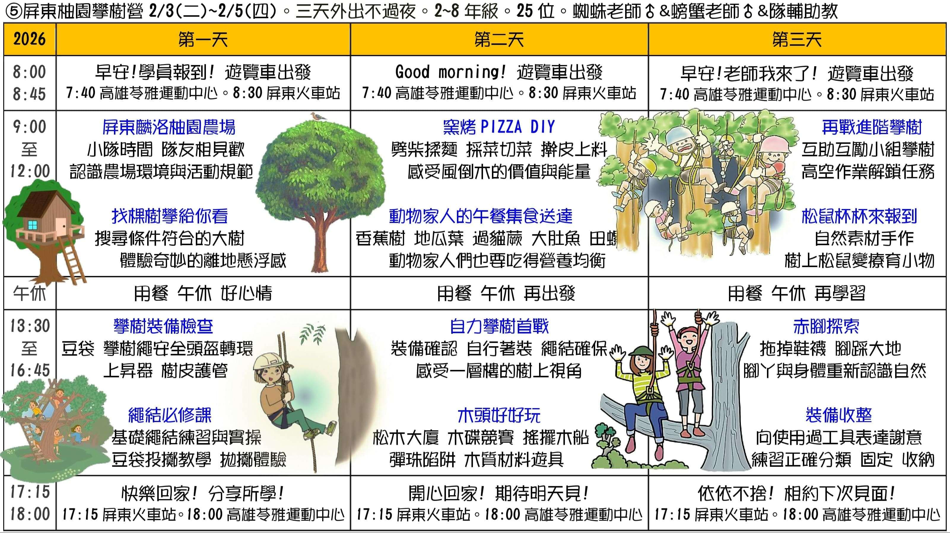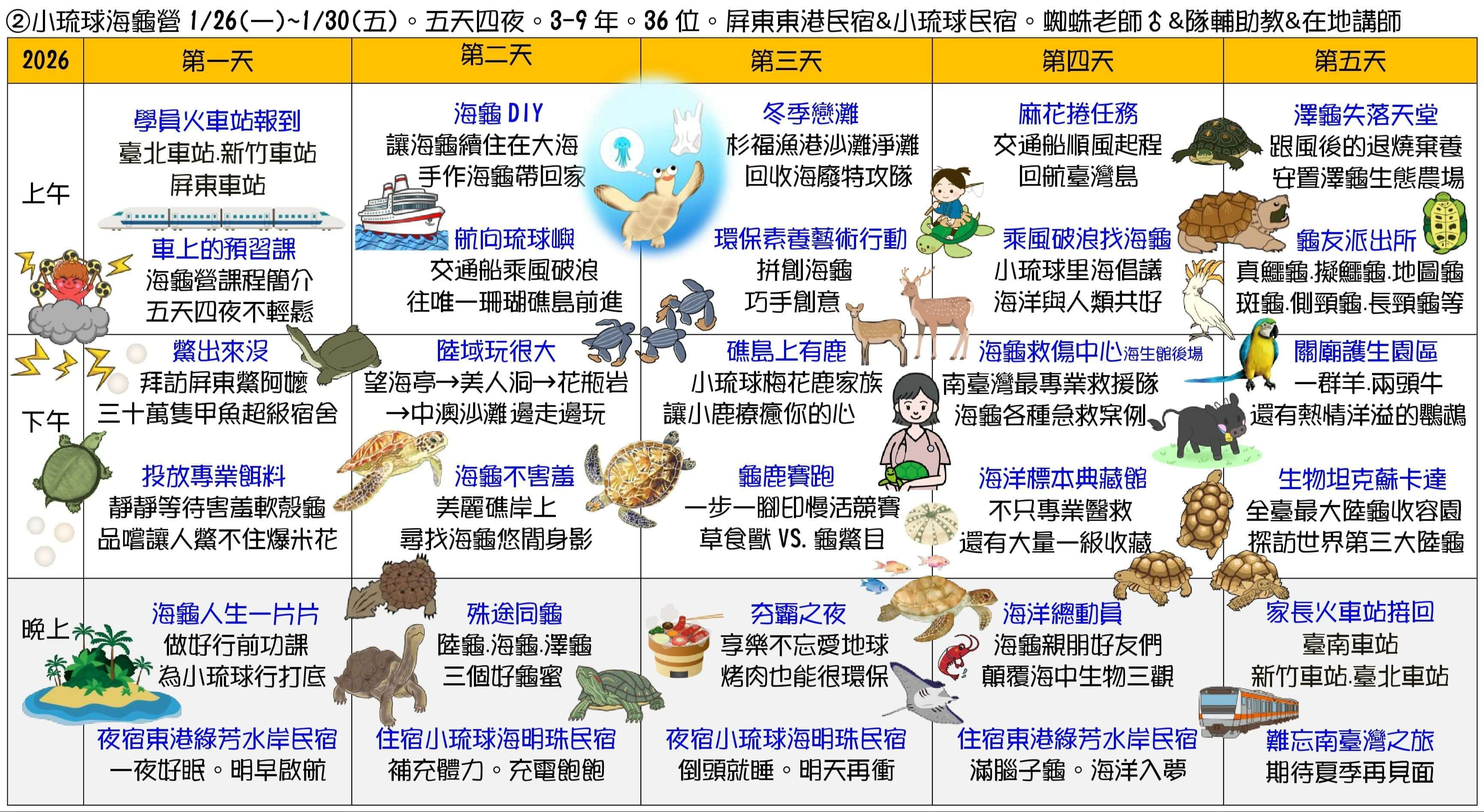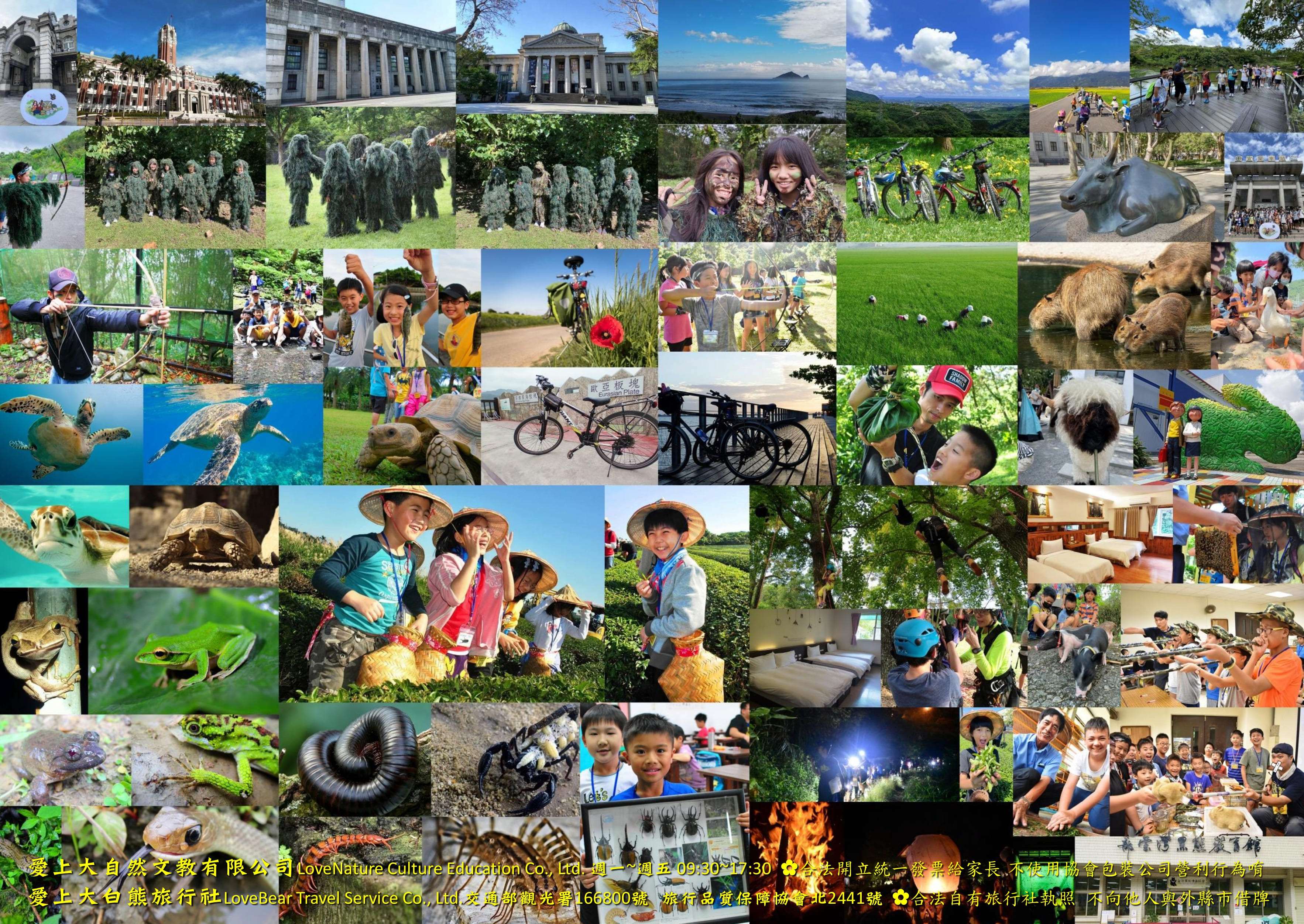 二、課程主題:①蘭陽山野求生營(5天4夜)、②小琉球海龜營(5天4夜)、③宜蘭生態農場營(3天2夜)、④TPE博物館生態營(3天外出不過夜)、⑤屏東柚園攀樹營(3天外出不過夜)、⑥節肢小怪獸營(3天大學不過夜)、⑦池上單車生態營(4天3夜)。