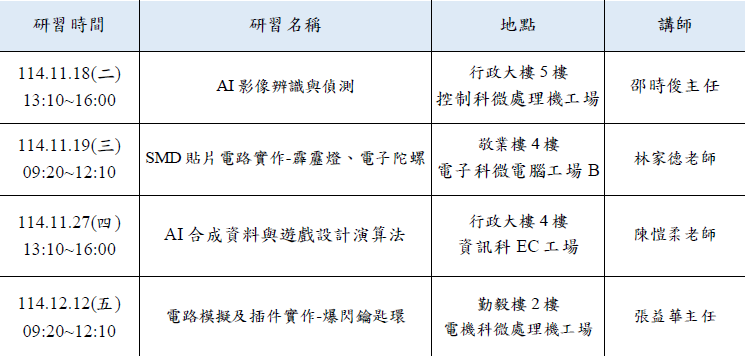 四、報名日期:即日起至11/12(三)下班前,錄取名單將於11/14(五)公告在大安高工首頁,請錄取同學務必準時參與課程。