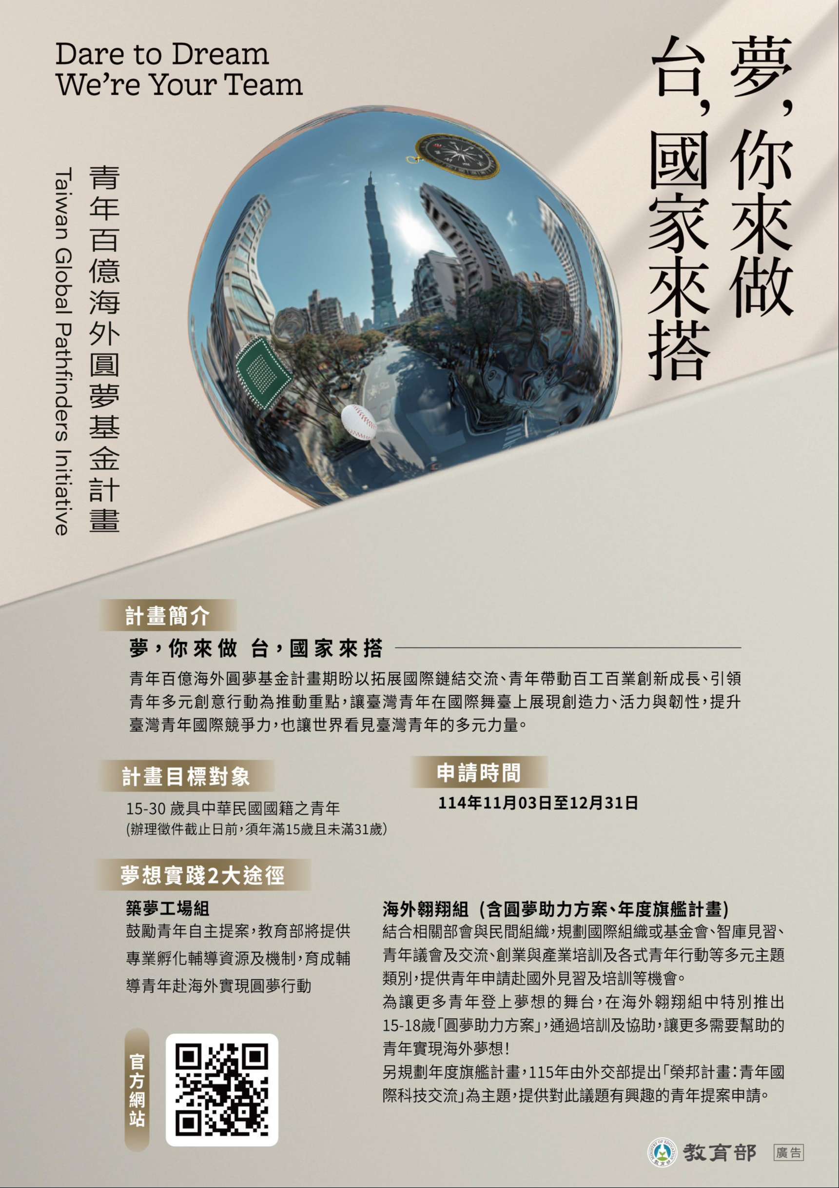 五、檢附「青年百億海外圓夢基金計畫」第一梯次築夢工場組、海外翱翔組簡章及計畫海報電子檔各1份。