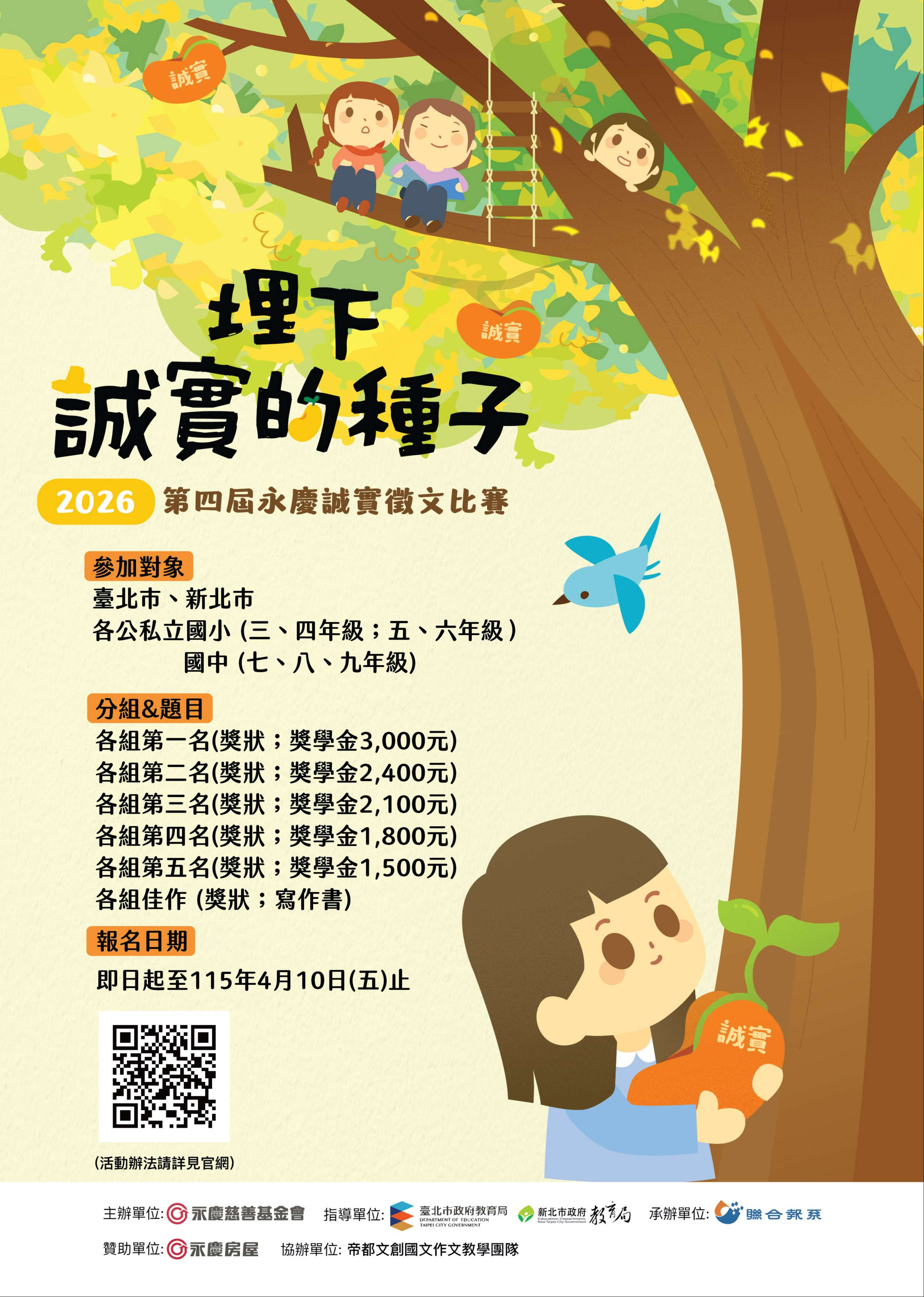 二、旨案乃為透過徵文活動,培養學生對於生活的觀察力,並從寫作中探索自我價值與思潮,讓品格教育的觀念向下扎根,以「埋下誠實的種子」為主題,希望學生從將品格素養融入文字的過程中,亦將優良德行落實於日常生活、徵文活動內容摘要如下: