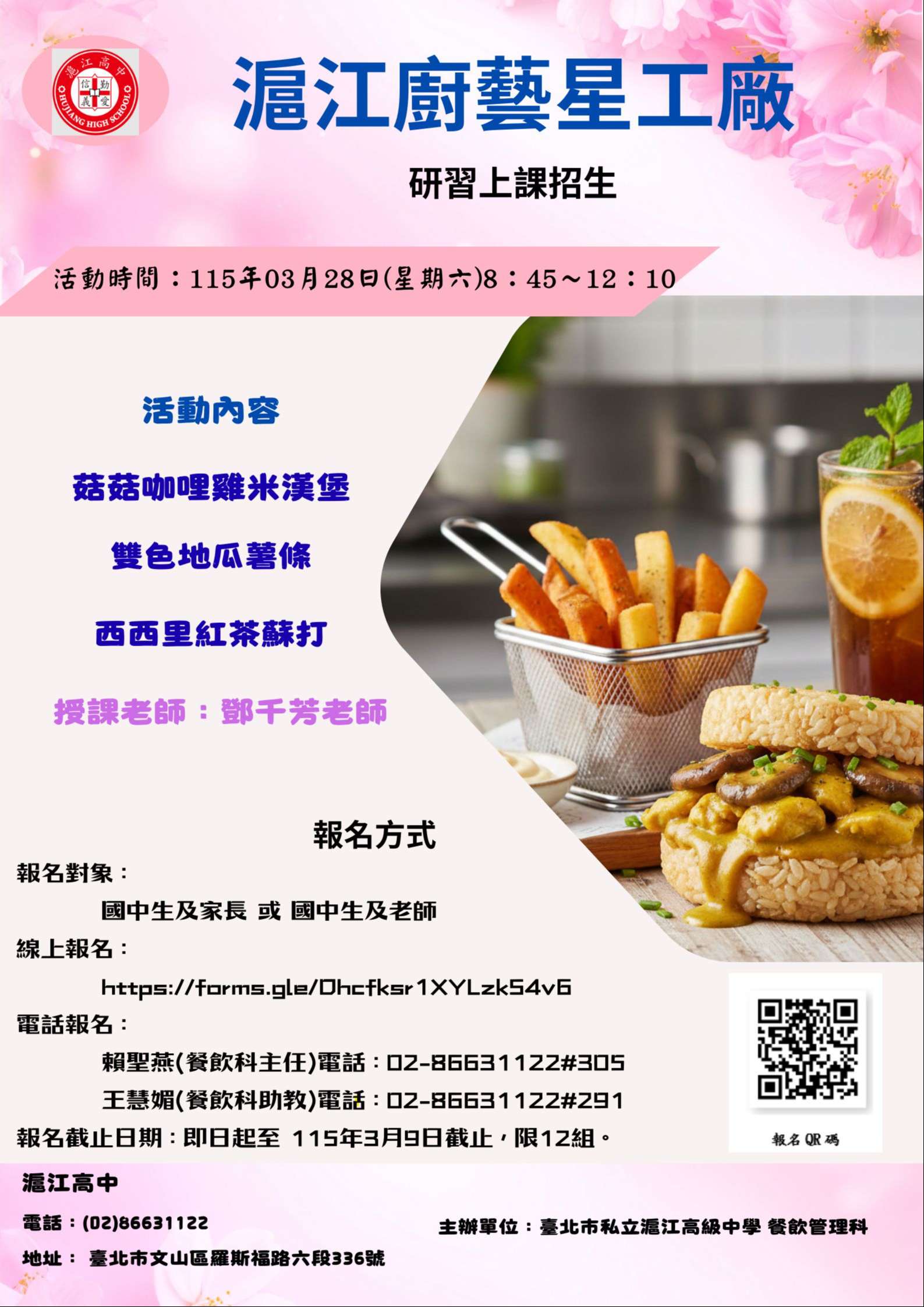 一、為協助國中學生適性發展與生涯探索,深化技職教育體驗與實作精神,辦理【櫻見學堂・職人手作】教育嘉年華,展示餐飲、航電、室設三科多元學習成果。