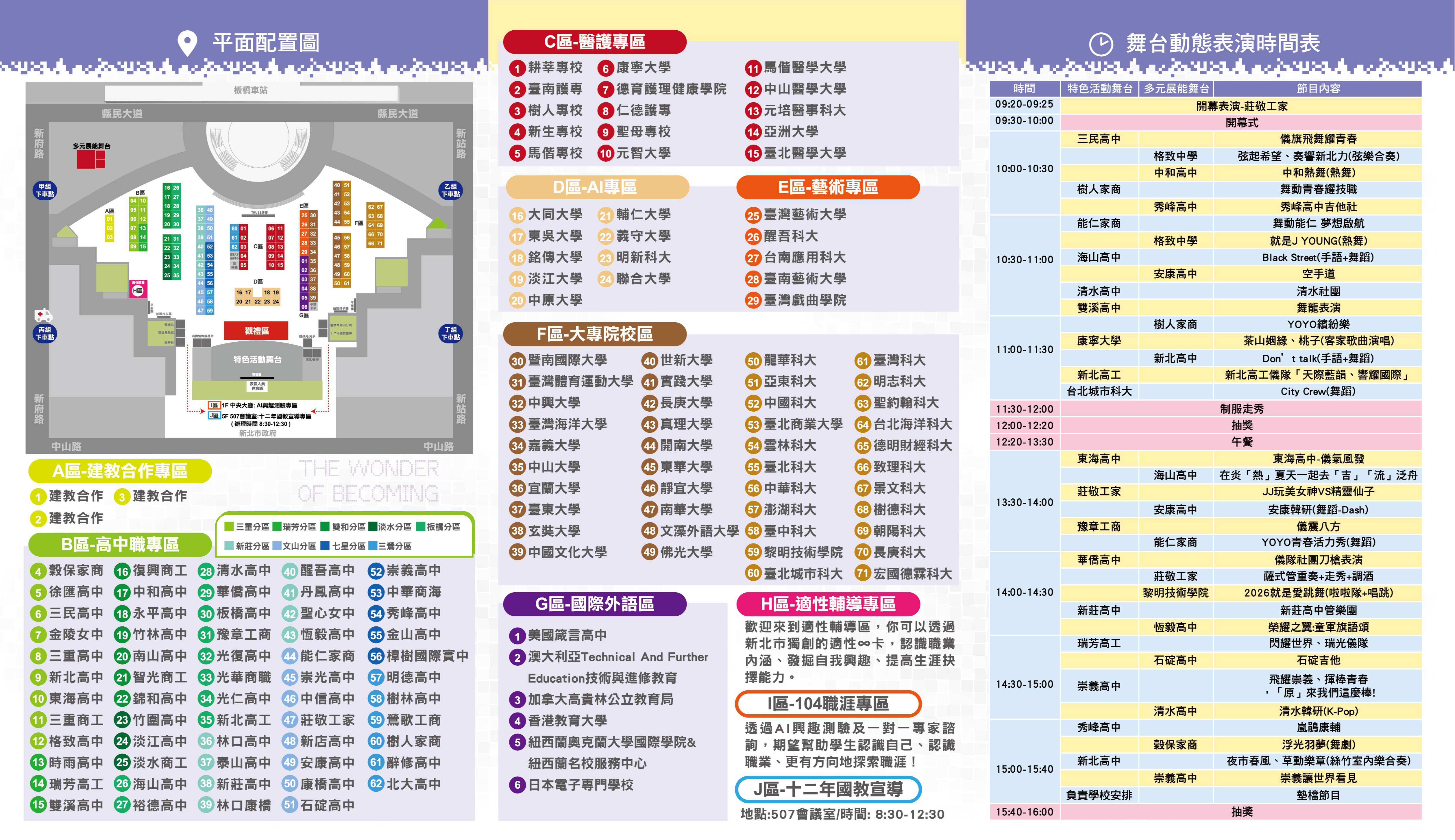 國際外語專區、適性輔導專區、104職涯專區及十二年國教宣導專區等,另安排超過30個精彩的表演節目,