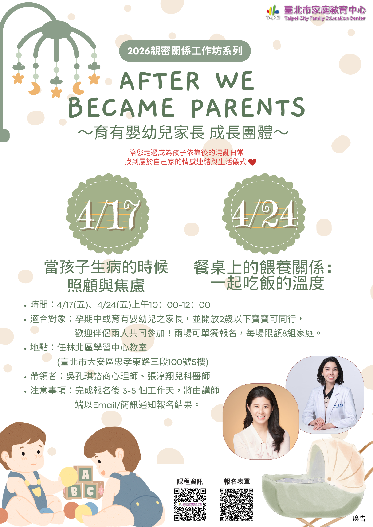 (一)適合對象:孕期中或育有嬰幼兒之家長並開放2歲以下寶 寶可同行,歡迎伴侶兩人共同參加,兩場可單獨報名, 每場限額8組家庭。