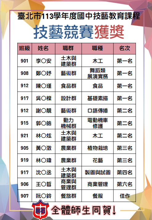 賀!!本校同學參加112學年度臺北市國中技藝競賽榮獲佳績